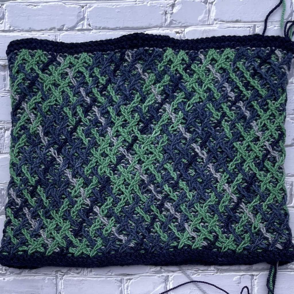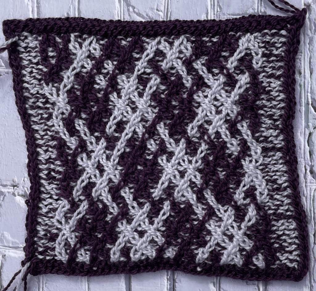 The cables no longer use a tabby weave structure (that is, they don’t go over/under/over/under). Instead the cable in the colour of the diamond, crosses in front. Question to weavers: does this weave structure have a name?