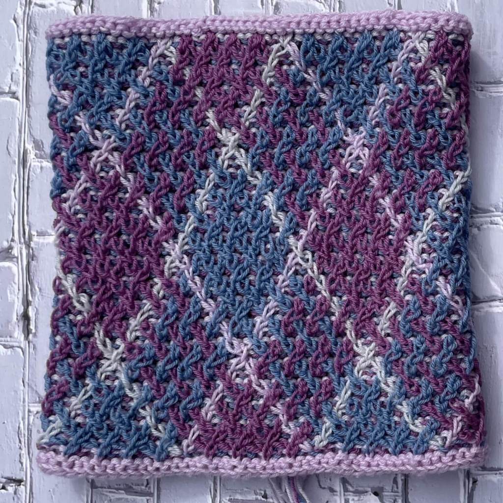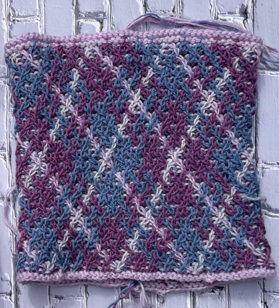 The other change was that in #5, the grey & purple were worked on the purl rows and the blue & green were worked on the knit rows. As many of you know, I do most of my designs over purlwise garter because this helps the design elements pop more.