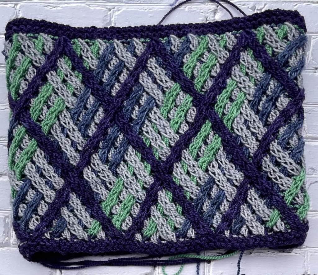 Over the last few months, I have been playing with putting woven patterns onto knitted fabric. Originally I was working on 2 colour reversible designs but got distracted and started chasing the argyle motif. This is how I got to an argyle motif that I am happy with.
