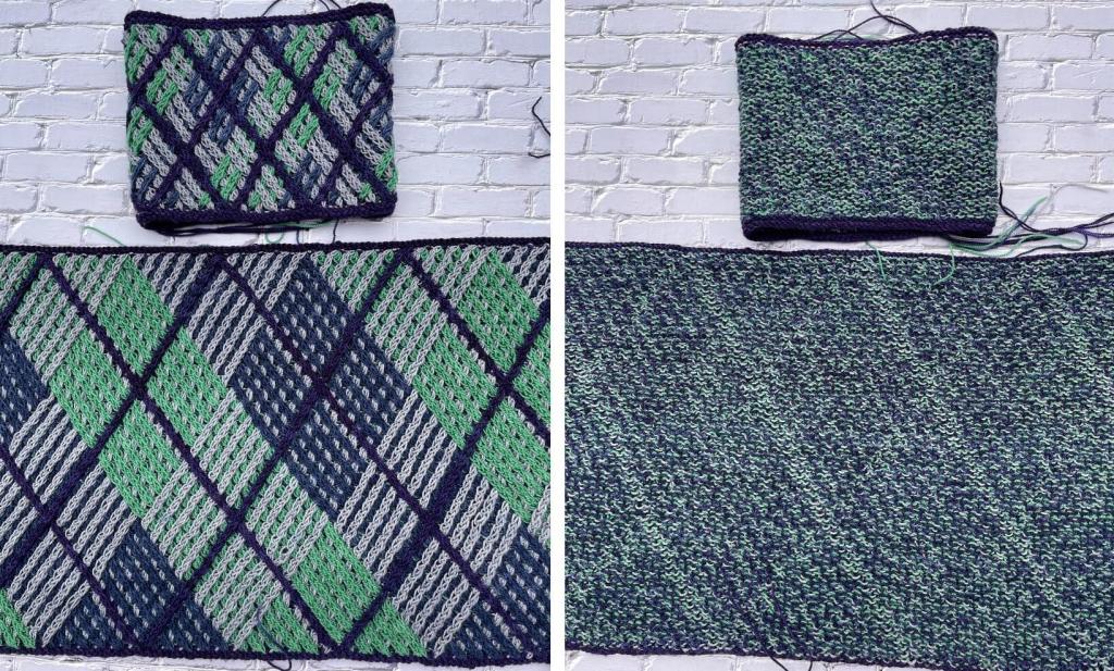On the larger swatch, the blue & green are worked on the purl rows and the grey & purple on the knit rows. The pattern formed on the back by the purple lines is very distinct. The effect of the grey on the knit rows is evenly distributed across the whole fabric so we don’t perceive its effect.