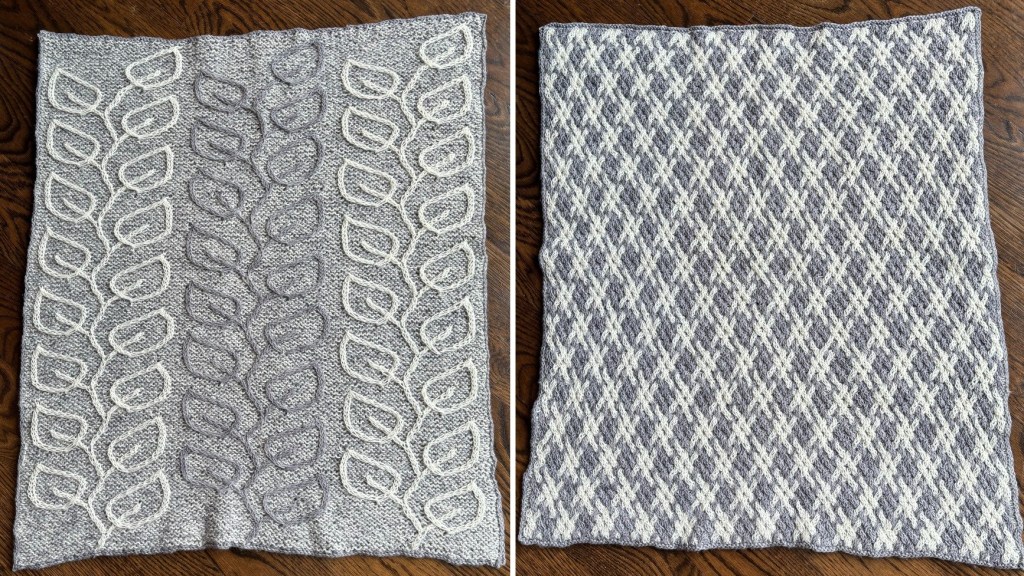 This blanket was created following the 3 Rules of Fission Knitting. This allowed me pair the leaf motif from the Secret Garden Blanket and a houndstooth knitted weave without creating a pattern for the combined motif.